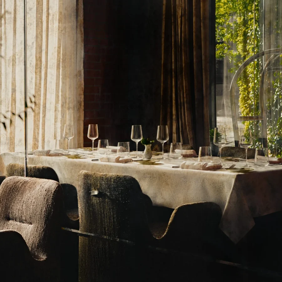 przestrzeń restauracji stwarza kontekst do doświadczania towarzystwa, potraw, wina i wszelkich detali dobranych z przemyślaną starannością